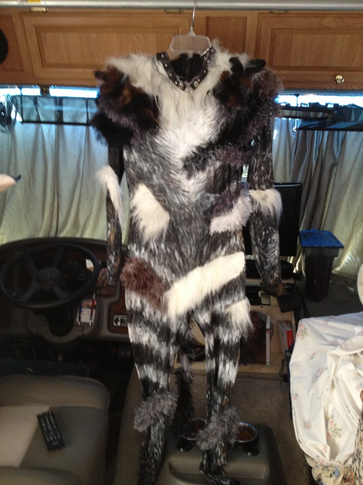 This photo you can see what I hand sewn on my costume, one by one of these fur pieces I put together from the extra frayed yarn from the wig. You can barely see the white fur along the neck line but it is there.